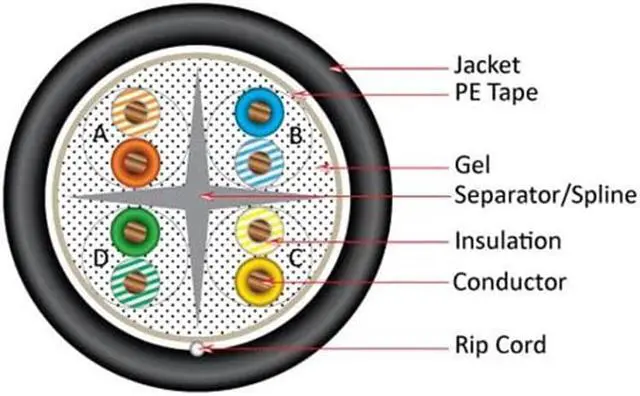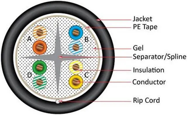 This CMXF Cat 6 unshielded (utp) cable is a high performance data communication cable suitable for high-speed data applications, gigabit ethernet, fast ethernet and 155Mbps TP-PMD/CDDI. It has excellent attenuation and crosstalk characteristics and exceeds TIA/EIA-568-C. 2 specification. This ethernet cable is designed for underground ( direct burial ) outdoor network installations and is approved by ETL to be type CMX. The wires are 23 awg in size and are made of solid bare (pure) copper conductors. All 4 pairs are easily identified by color stripes. The insulations are made of PE and the jacket is made of UV resistant LLDPE and the core of the cable is filled with waterproof gel.