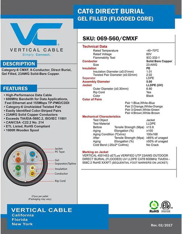 This cable is supplied in 1000 feet wooden spool and sequential length markings are printed on the jacket. Brand for this product is Vertical Cable.