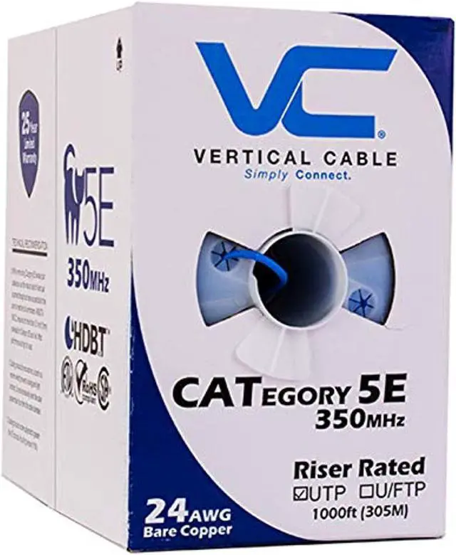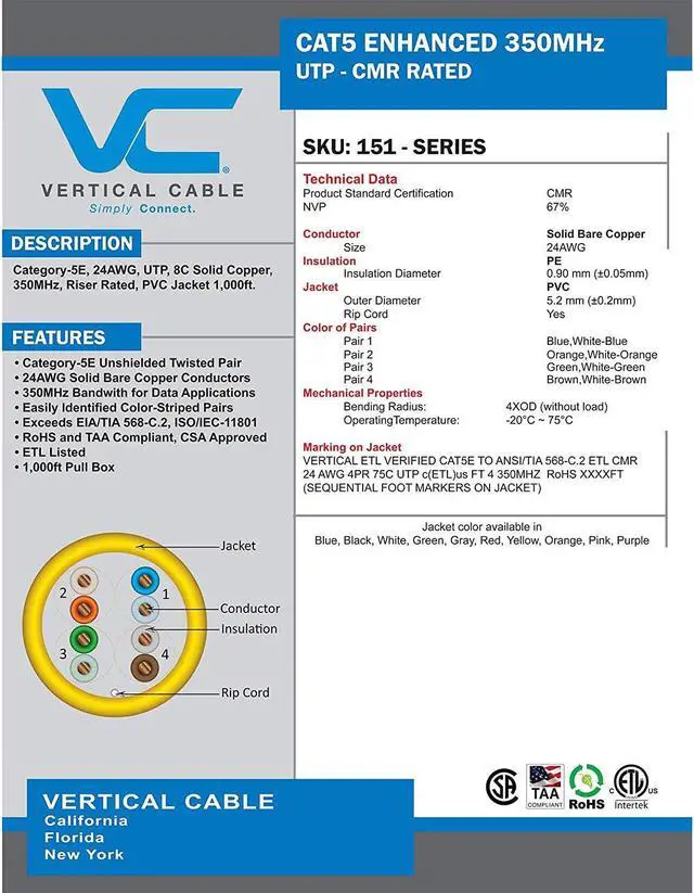 This Cat 5e unshielded twisted pair ( utp ) cable is a high performance data communication cable suitable for 350mhz high speed applications. It has excellent attenuation and crosstalk characteristics and exceeds TIA/EIA-568-C.2 specification.This ethernet cable is designed for indoor and riser network installations and is approved by ETL to be type CMR. The wires are 24 awg in size and are made of solid bare copper conductors. All 4 pairs are easily identified by color stripes. The insulation material is PE and the jacket is made of PVC. This cable is supplied in 1000 ft pull box and sequential length markings are printed on the jacket. Brand for this product is Vertical Cable.