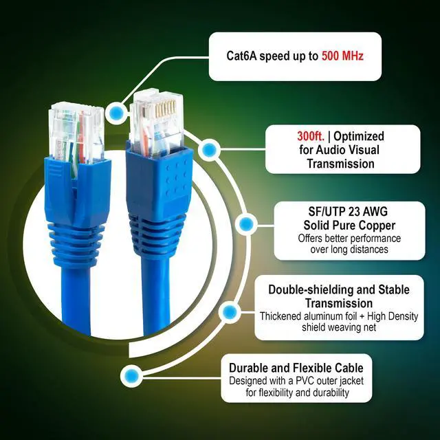 Enjoy high-speed connectivity and outstanding performance with the 300ft CAT6A SF/UTP Ethernet cable from J-Tech Digital. Designed for data transfer rates up to 10Gbps and a bandwidth of 500MHz, it ensures seamless audio-visual transmission and dependable high-speed networking. Built with 23AWG solid pure copper conductors, it minimizes signal loss over long distances for durable, consistent performance. Ideal for homes, offices, or commercial environments, its extended length supports a wide range of applications, including networking and Audio/Video distribution systems. Provides optimal performance when using with J-Tech Digital AV over IP systems and HDMI over Ethernet extenders.