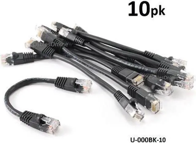 10-Pack 6 inch CAT.5e UTP Patch Ethernet Cable with Snag-less Molded Boots, Black * Impedance Matched * Gold Plated Contacts * Snag Free Boots * Strain Relief * Standards Tested * RJ45 Male/RJ45 Male * Length: 6 inches * Color: Black * Specifications * UTP * UL Listed * Certified to 350 MHz * EIA/TIA Approved * 4 Pairs * RJ-45 Connectors CablesOnline Part Number: U-000BK-10