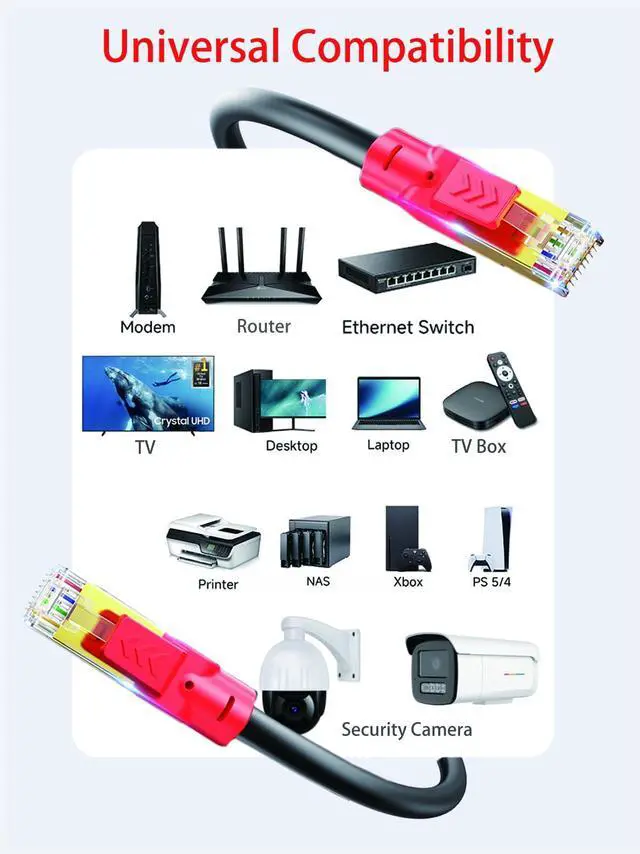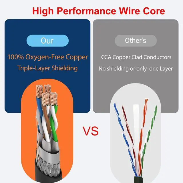 Crafted from 100% solid OFC, not low-cost CCA. CCA is brittle, causes high signal loss and is unsafe for PoE. Our pure copper cable delivers full Cat 8 speed and lasting durability, a far better long-term investment than aluminum substitutes