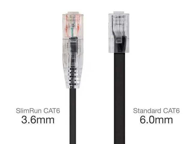 SlimRun Cat6 is much thinner and lighter than standard Cat6 cables. The 0.149-inch diameter, 28AWG flexible cable and snagless narrow boot design is easier to install/uninstall and takes less space than conventional 23 or 24 AWG Cat6 cables.