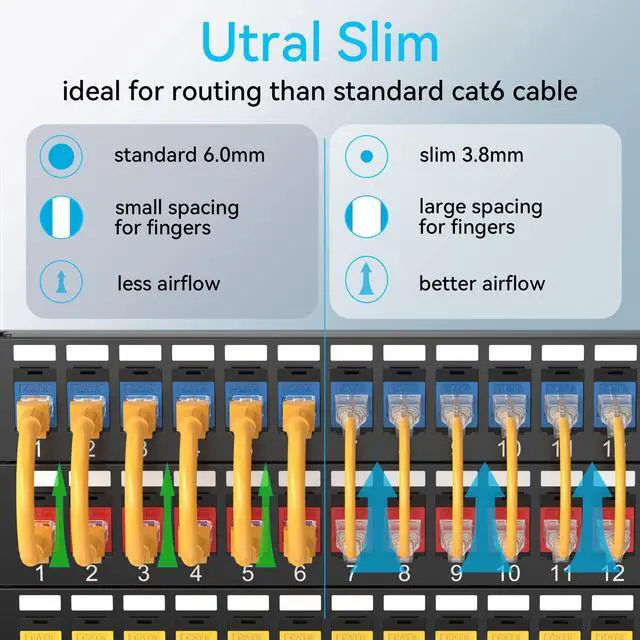 The thin cat 6 ethernet cable declutter network rack and makes the patch panel to switch connections look so neat.