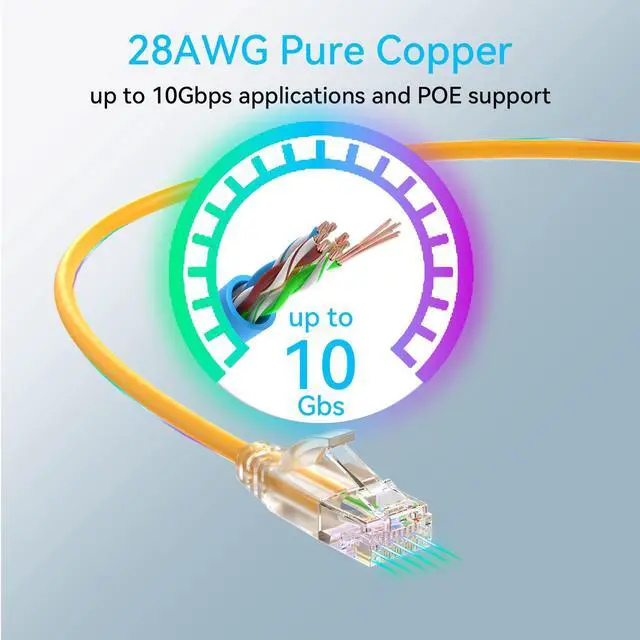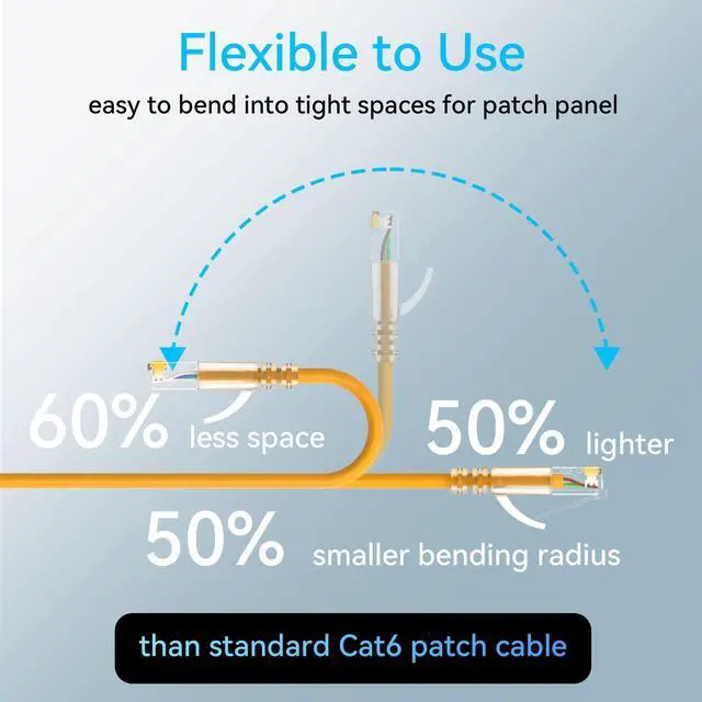 Ethernet patch cable slim are 60% less space, 50% lighter and 50% smaller bending radius, compaired with standard 24awg cat6 patch cables, but keep same performance for data transmission.