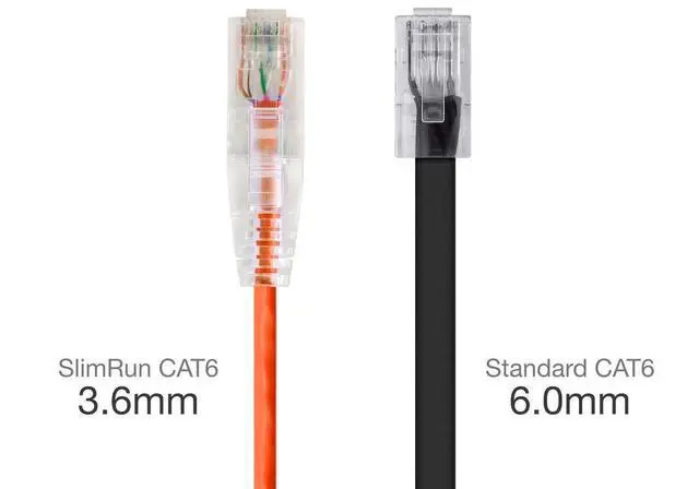 SlimRun Cat6 is much thinner and lighter than standard Cat6 cables. The 0.149-inch diameter, 28AWG flexible cable and snagless narrow boot design is easier to install/uninstall and takes less space than conventional 23 or 24 AWG Cat6 cables.