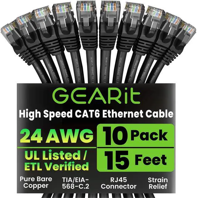 • High-Performance Cat 6 Ethernet Cable Pack GEARit's 10-pack of 15 ft Cat6 ethernet patch cables features 24 AWG UTP stranded conductors twisted in an X-structure spline to minimize crosstalk and deliver full 10 Gbps bandwidth - future-proof network cables for home, office, data-center, and server use.