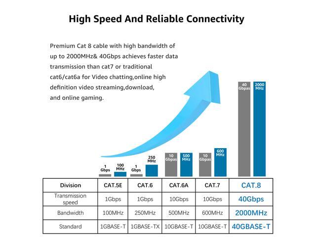 - High Speed: newest version ethernet cable cat8 achieve data transmission speed 40 Gigabits and bandwidth up to 2000Mhz. It can be used to connect computer, laptop, Modem, Router, PS3, PS4, x-box, Patch panels, switch, network printer, projector, camera at maximum speeds.