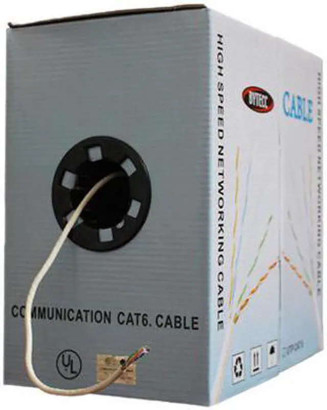Cable Type: UTP (Unshielded Twist Pair Cable) Wire Type: Solid Copper Conductor Wire Gauge: 23 AWG and 4 pairs Provides hi-speed data transfer to 550Mhz Colored PVC Outer Jacket UL Certified Record chart on box for cable usage Extra-large outlet hole for easy pulling Dual boxes for extra cable protection