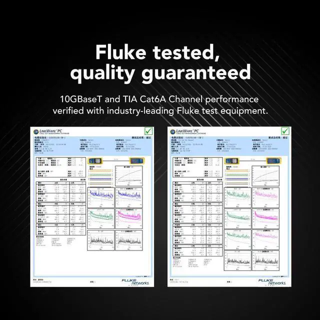 10GBaseT and TIA Cat6A Channel performance verified with industry-leading Fluke test equipment.