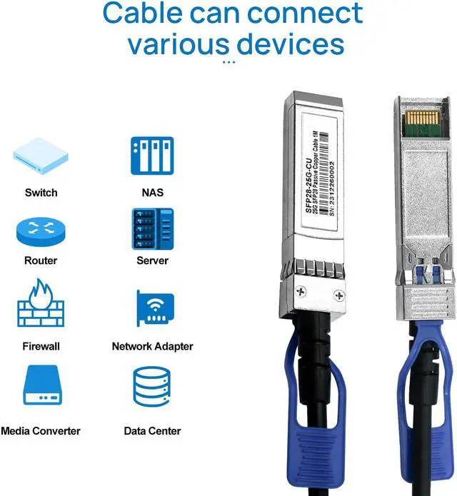This passive cable is the preferred choice for 25G rate short-distance applications, commonly used for data transmission between data centers and cabinets or adjacent cabinets. It effectively increases port density, reduces costs, and is suitable for high-density connections between network devices.