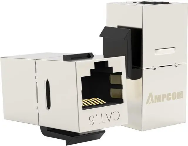 Fully shielded coupler with 180 angled port connects two Cat6 cables to provide feed-through patching with standard data wall plates