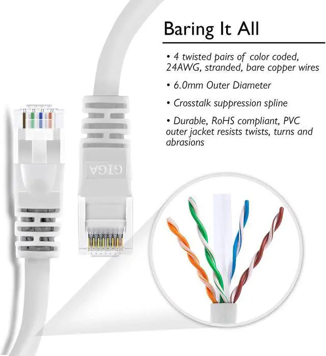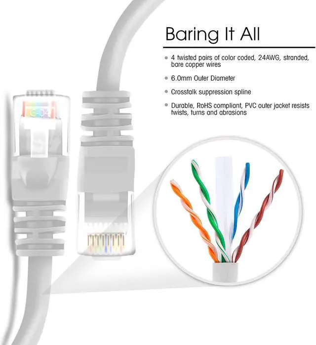 • UTP 24AWG stranded conductors for flexibility, twisted in pairs and nested in a spline to minimize crosstalk, 50 micron gold-plated contacts for high-speed data transfer and corrosion resistance, as well as molded, snag-less strain relief boots for long lasting, durable connections