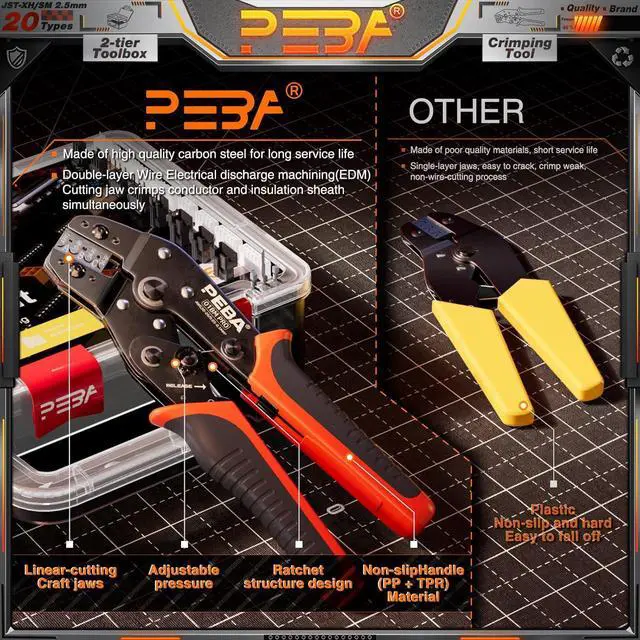 Pro-Crimping Tool: Crimping tools have efficient ratchet mechanisms and professional crimping dies. Double-layer Wire Electrical discharge machining(EDM) Cutting jaw crimps conductor and insulation sheath simultaneously.