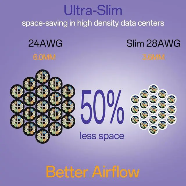 Ultra-Slim: Slim CAT6 patch cord is 50% thinner than standard networking cables. Slim Cat6 UTP patch cable is designed for space-saving in high density environments such as data centers telecommunication and server rooms.