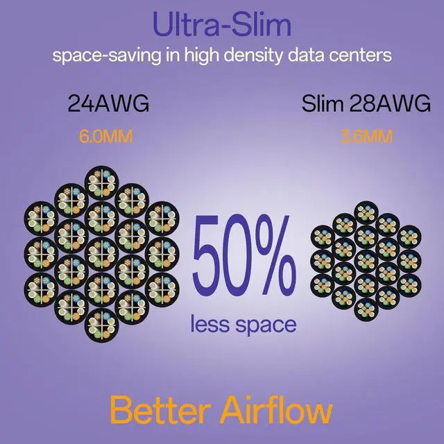 Ultra-Slim: Slim CAT6 patch cord is 50% thinner than standard networking cables. Slim Cat6 UTP patch cable is designed for space-saving in high density environments such as data centers telecommunication and server rooms.