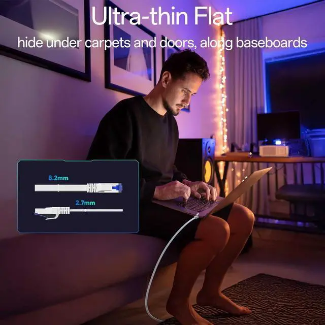 Ultra-thin Flat: Flat ethernet cable has a thickness of only 2.7mm, making it easy to hide under carpets and doors, behind furniture, along baseboards and walls, bringing a clean and professional appearance to homes and offices. Cat 8 ethernet cable 50 ft are perfect for neat and tidy setup without clutter.