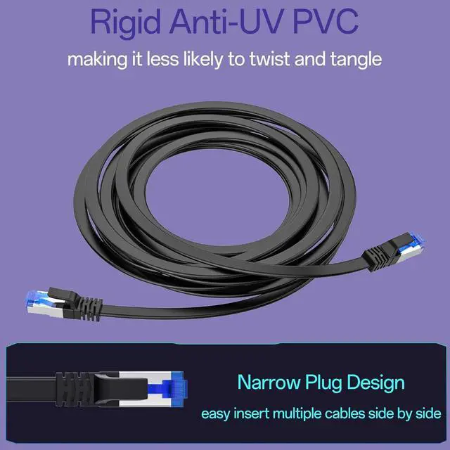 Narrow Plug Type: Cat8 ethernet cable 50 ft use narrow RJ45 plug molds, making it easy to insert multiple cables side by side into routers, Ethernet switches, and PCs. Some other ethernet cable 50+ ft with additional sections on the side of the plug will fight with each other, and if the ports are too close, they cannot be fully installed. Lan cable high speed gaming can also easily pass through conduit if needed.