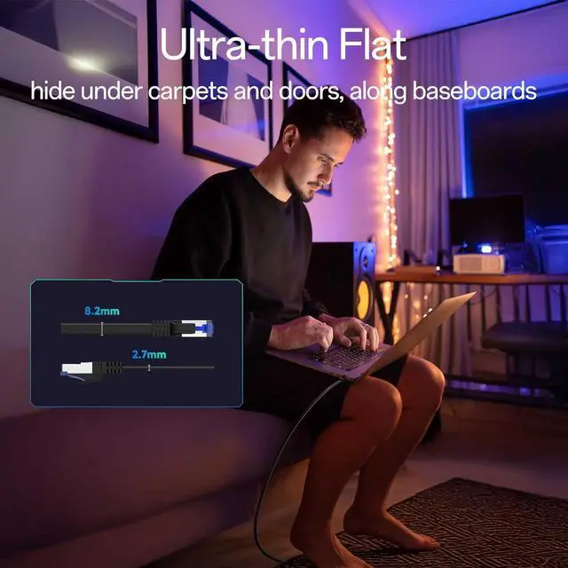 Ultra-thin Flat: Flat ethernet cable has a thickness of only 2.7mm, making it easy to hide under carpets and doors, behind furniture, along baseboards and walls, bringing a clean and professional appearance to homes and offices. Cat 8 ethernet cable 50 ft are perfect for neat and tidy setup without clutter.