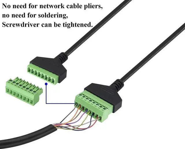 90 Degree ( Down Bend)RJ45 male head to 8PIN wiring type network welding-free green terminal 8P 8C crystal head to 8-bit terminal Cat5 straight-through network extension cable.For use with baluns with RJ45 video ports.