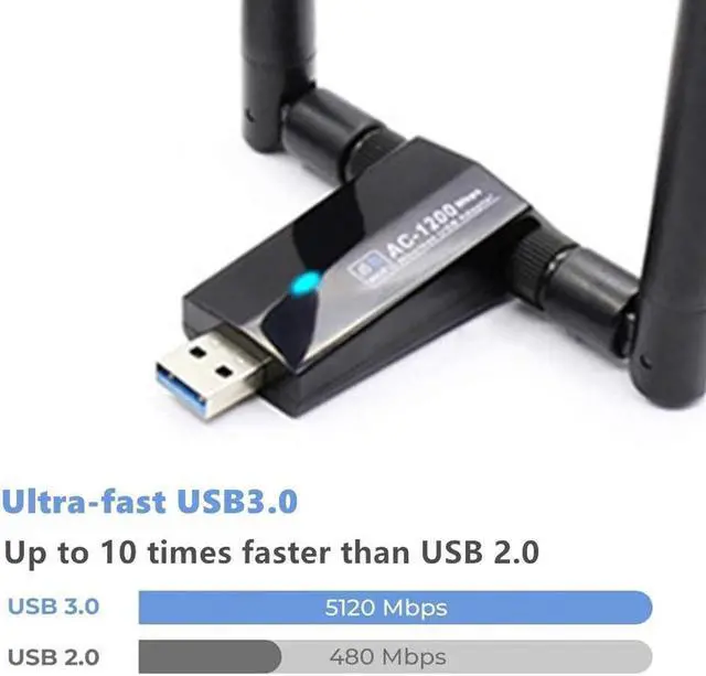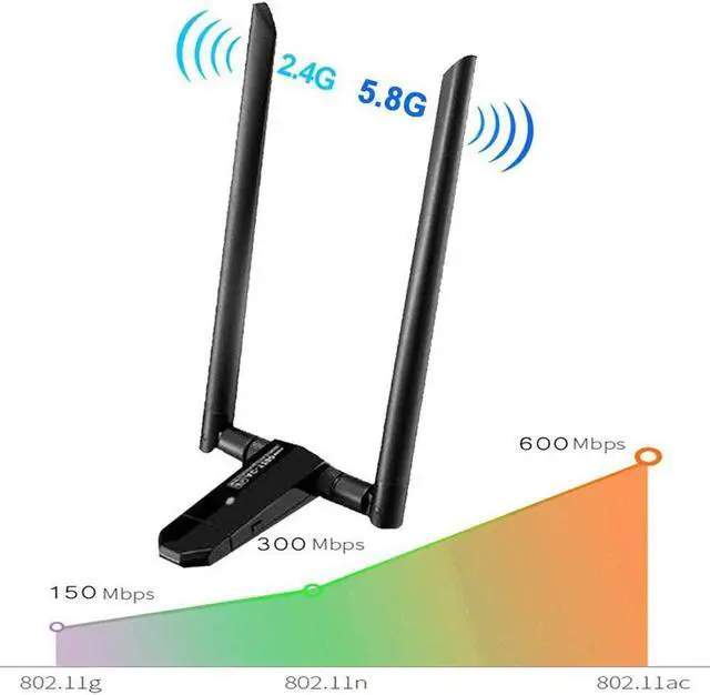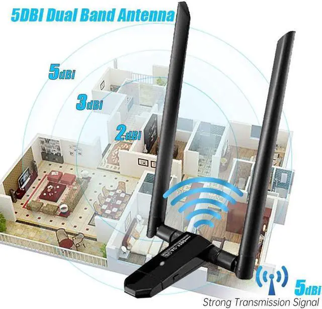 ?? 1200Mbps Ultra-Speed?? Up to 1200Mbps Wi-Fi speeds on 5GHz (867Mbps) or 2.4GH z (300Mbps) bands the wifi adapter provides fast speed and lag free connection for PC Laptop desktop ideal for telecommuting home office internet calling/meeting HD video/movie high quality music online gaming etc.?? 5dbi High Gain Antenna?? The 5dBi dual high-gain antenna and 360-degree and 90-degree rotation designs of the computer network adapters provide stronger signal penetration wider coverage and wireless coverage up to 100 meters. It allows you to enjoy a wifi connection without blind spots whether at home or in the office and provides excellent stability for desktops laptops and PCs.