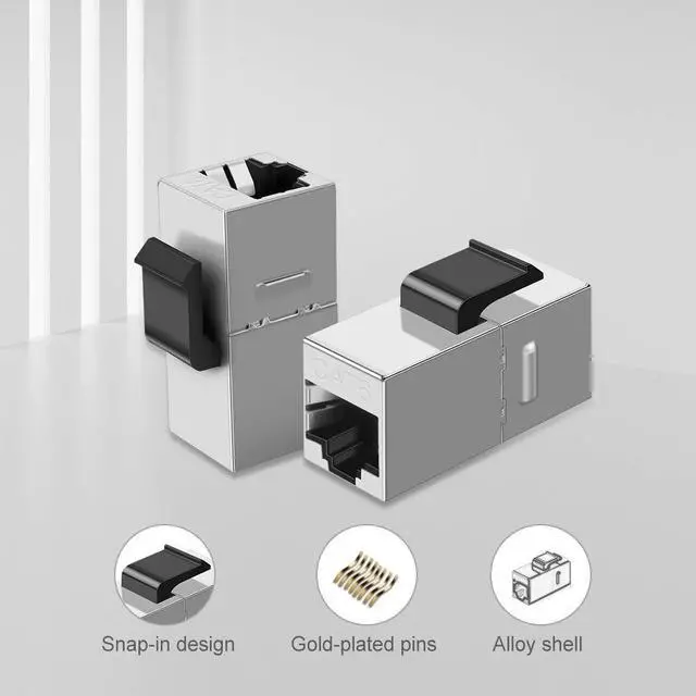 Specifications .Suitable for panel connection .RJ45 female to female .Pin Assignment: 1:1 .Material enclosure: ABS non halogen UL 94V-0 .Material surface: copper with Nickel plated .Material of PCB: FR4, 1.2mm thickness .RJ45 8P8C pin is gold plated .Mating cycles: 750 .Operating temperature: -10 C~ +50C Package include 5 x Cat6 Modular Coupler