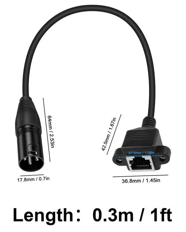 • Connector 1: XLR 3-pin male plug; Connector 2: RJ45 Female Connector; Cable length: 30cm/11.8inch. Package Contents: 1x 3-pin XLR Male to RJ45 Female adapter