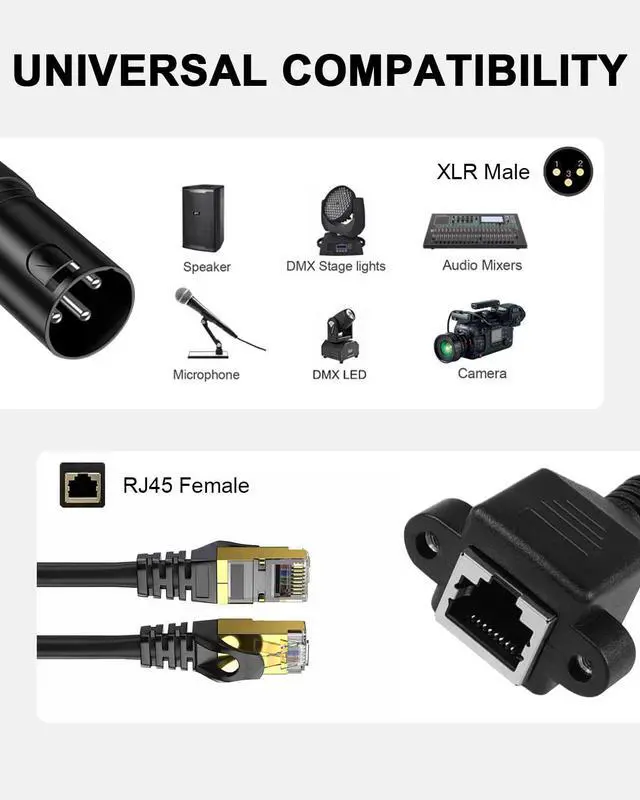 • [RJ45 to 3 PIN XLR Cable] XLR to RJ45 Adapter, can convert a XLR 3-pin connector into a network RJ45 connector for extending and transferring signal transmission as well as great for your LED light signal controller.