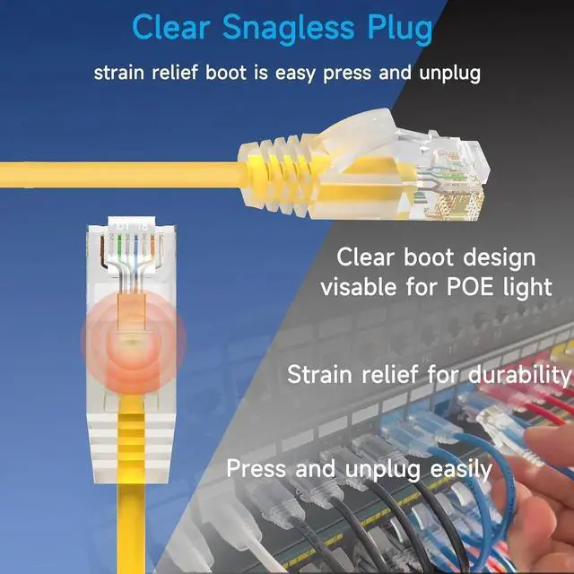 • Network patch cables are made of clear tap Snagless plug with strain relief boot for maximum durability. Cat6 patch cords with snagless plug is easy press and unplug. Clear boot of slim cat6 patch cable allows to see the light of the POE ports easily.