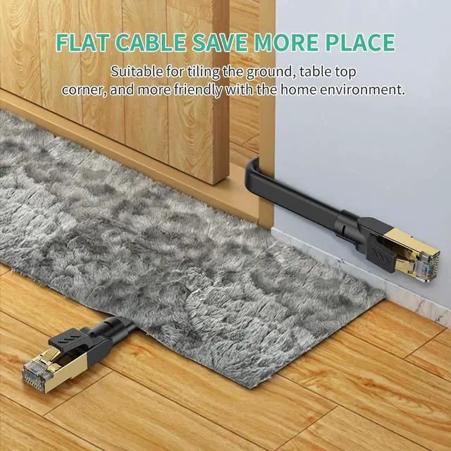 Flexible Flat Design Cat 8 rj45 cable adopts a unique flat and thin design, which allows for a cleaner and safer installation. Whether you want to install it under the door, through the window, or hidden under the carpet, it can be done very easily. It' s very suitable for indoor wiring