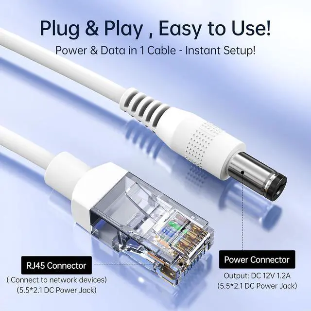 PoE 48V to DC 12V/2AConvert 48V PoE to DC 5.5*2.5mm 12V/2A output. DC cable for power supply and RJ45 cable for netework. Non-PoE devices with DC 5.5*2.5mm ports can enjoy the same convenience of POE power as POE devices