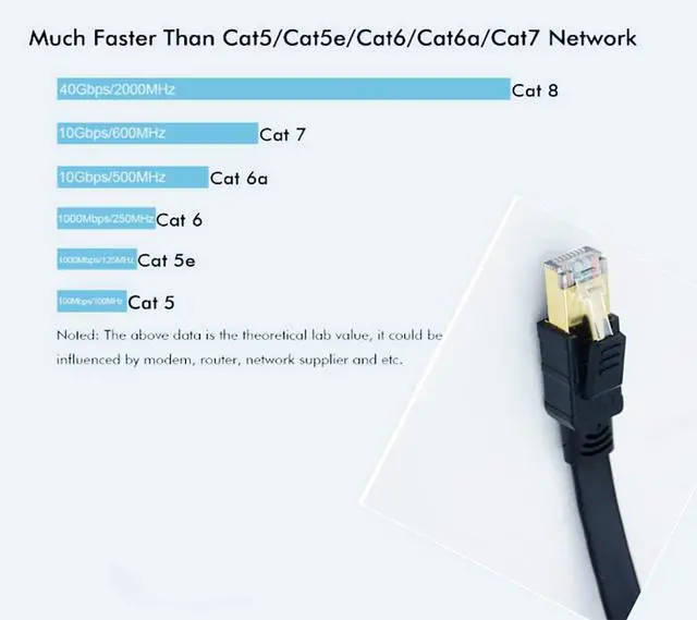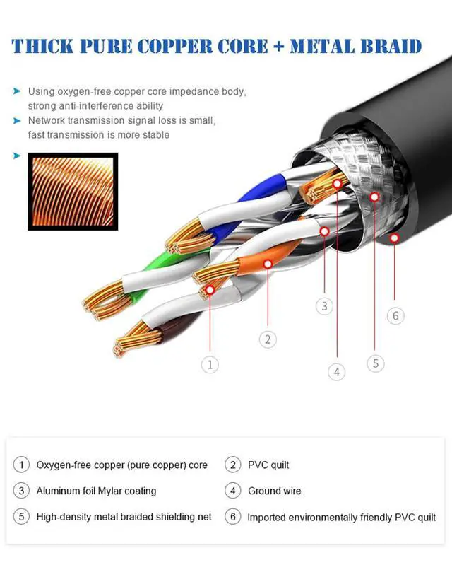 Cat8 Ethernet cable is made of 4 shielded foiled twisted pair(SSTP) and single strand OFC wires(26AWG) which supports bandwidth up to 2000MHz and boosts the speed of data transmission up to 40Gbps. Shielded Cat8 and the improved quality in twisting of the pairs, Cat8 can reduce any signal interference to the full extent. Allow you to stream HD videos, music, surf the net, play games at Hyper Speed.