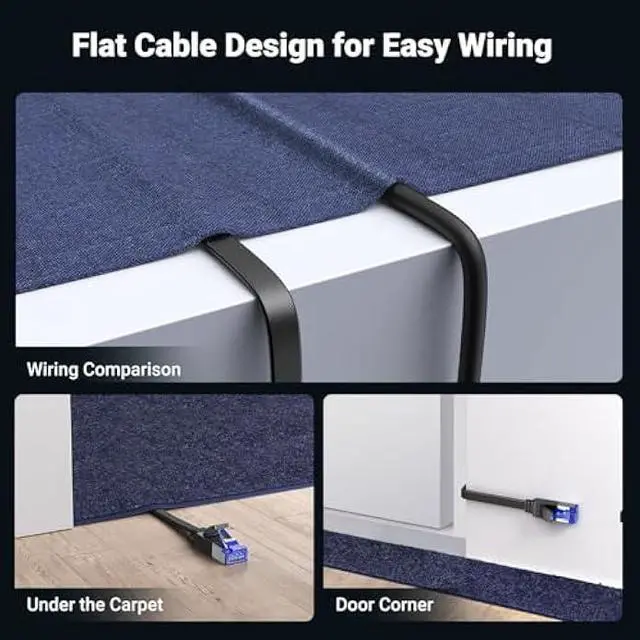 Flat Structure: Flat ethernet cables are highly advantageous for their flexibility and better protection against snags than round cables. Thanks to their flat structure, ethernet cable easily adapt to different surfaces, so they can easily be tucked under a carpet, ran through the door corner, or along the wall