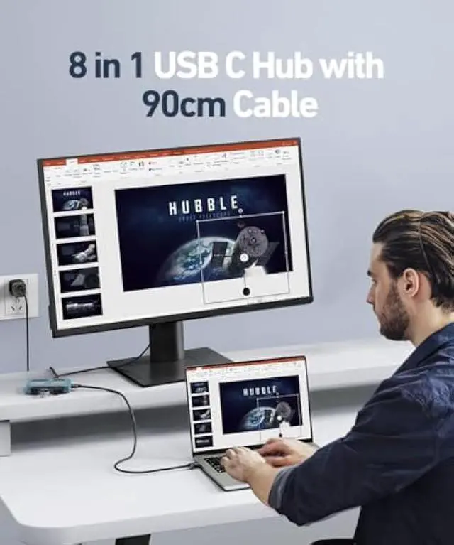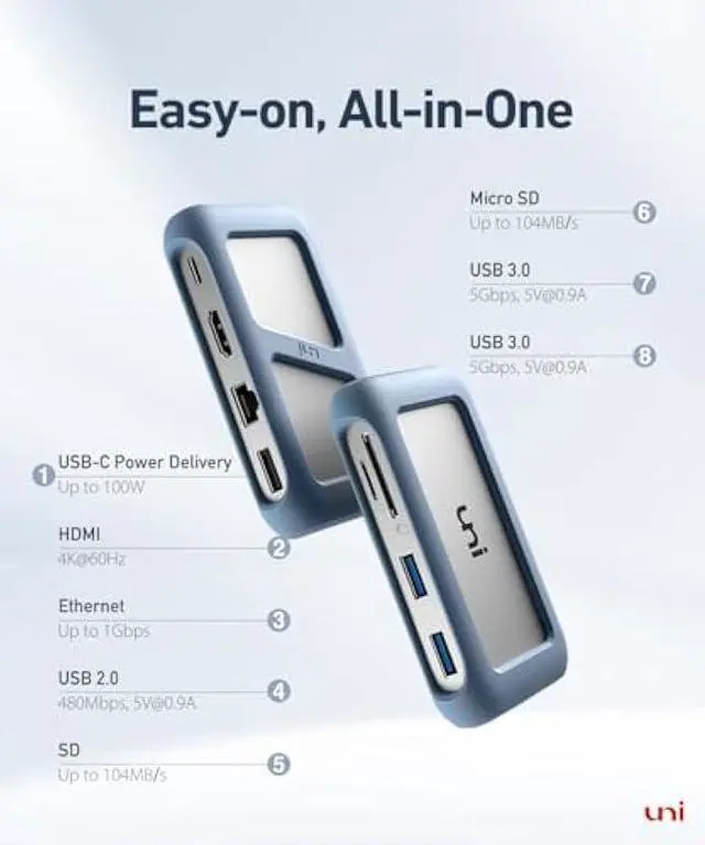 8-in-1 Multi-Functional USB C HubThe uni USB C hub is perfect for Mac series families with Macbook Pro/Air and iPad Pro users. Enjoy 1*4K@60Hz HDMI, 1*Ethernet port, 100W PD Port, 2*USB 3.0 (5 Gbps), 1*USB 2.0 (480Mbps), and SD/MicroSD Card Reader (up to 104 Mbps). Ideal for home offices, the USB C multiport hub provides you with more workspace and convenience.