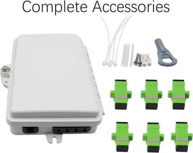 package content includes: 1x6 core FTTH optical fiber distribution box; 6 optical fiber plugs; installation accessories