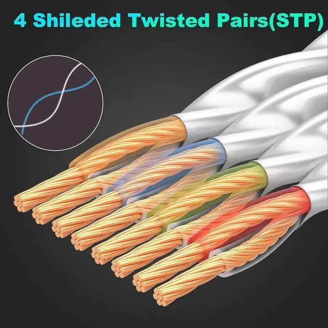 Superior StabilityGold-plated RJ45 connectors are for higher sensitivity and better stability; 4 Pairs STP cable of 100% thick copper wire ensure faster Internet speed; Each twisted pair contain one ground wire which can effectively reduce noise & interference.