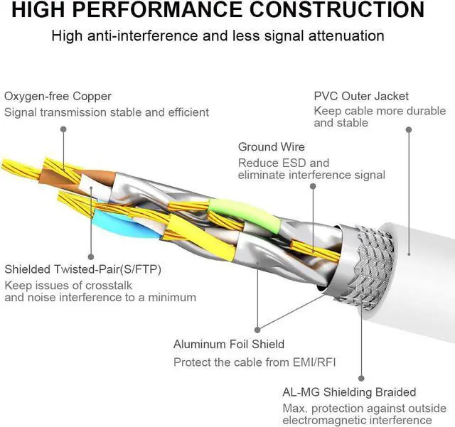 HIGH PERFORMANCE CONSTRUCTION: Made of 4 Pairs 100% 26AWG pure & thick shielded twisted pair (STP) of copper wires which provide better protection from crosstalk, noise, degrade the signal interference. Shielded RJ45 connectors with 50 micron gold-plated contacts ensure corrosion resistance & long-term performance (without noise or signal loss)