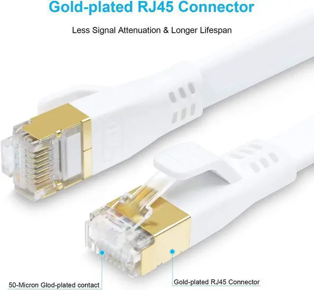 PREMIUM QUALITYAll our CAT8 cabkes are made of 4 pairs 100% 26AWG pure and thick shielded twisted pair (STP) of copper wires with two shielded, gold-plated RJ45 connectors on each end. It provides better protection from crosstalk, noise, and interference that degrade the signal quality, the network speed is more stable. Premium RJ45 Snagless Connector Jack provides durability, and ensure a secure connection.