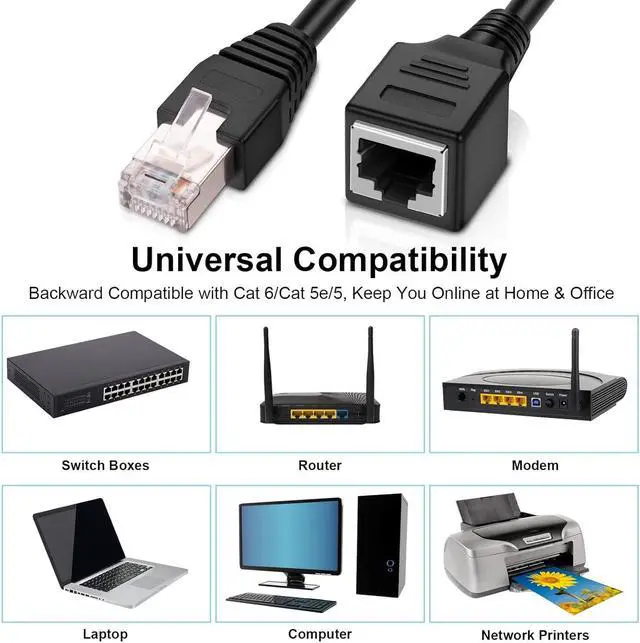 The rj45 extension cable connects universally with LAN network components such as PCs, computer servers, printers, routers, switch boxes, network media players, NAS, VoIP phones, PoE devices, Hub, DSL, xBox, PS2, PS3 etc.