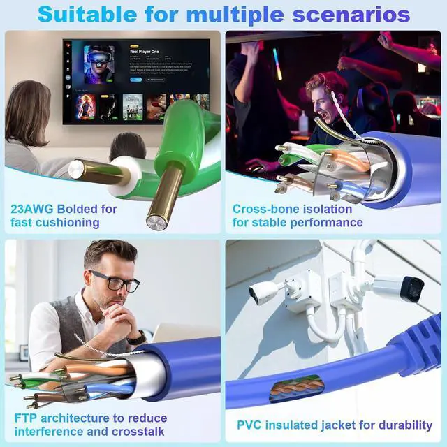 High-Durable Structures: Direct burial 23AWG Cat6 Outdoor/Indoor Ethernet cable pairs are isolated by LLDPED PVC cross-insulation to prevent crosstalk. Covered by a high quality PVC jacket to resist mechanical damage and weather, it can be used Outdoor/Indoor or in other harsh environments, and can maximize its service life. An extra layer of plastic secures the pairs to the cross to prevent them from falling out, enabling stable downloads and uploads of large files, media content, conducting video conferencing and more.