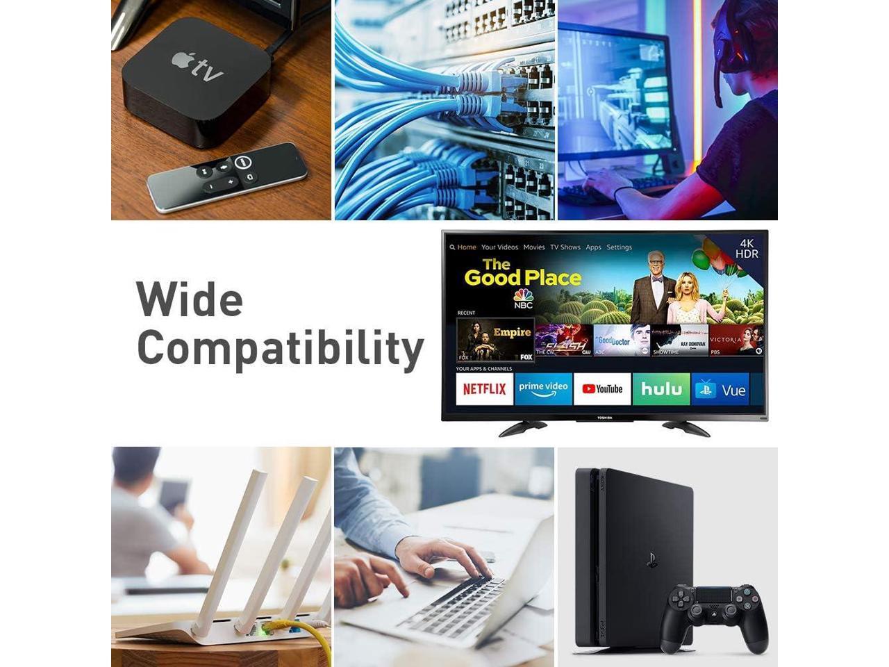 - Universal Compatibility: The Cat8 Ethernet cable works perfectly with networking switch, IP Cam, routers, Nintendo switch, ADSL, Adapters, Modem, PS3, PS4, PS5, X-box, Cloud data Server, Patch Panels, Servers, Networking Printers, Netgear, NAS, VoIP phones, laptop, Coupler, Hubs, Keystone jack, Smart TV, Imac and other device with RJ45 connectors. Compatible with Cat7/Cat5/Cat5e/Cat6/Cat6e