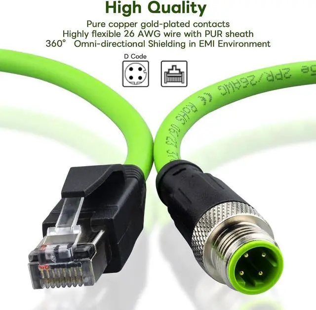 M12 to RJ45 Ethernet CableConnector A is RJ45, and connector B is M12 D code 4pin male. Operating Temperature Range-40~+85. Cat5e 26 AWG with Black PUR JacketInsulation flame retardant. IP67, 100% shielding. Cat5e 26 AWG with Black PUR Jacket