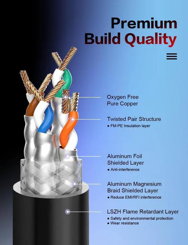 [Upgraded Structure] The Cat6 Ethernet cable are designed and constructed with shield foil twisted pair oxygen free copper wires with two RJ45 connectors on each end. Compared with unshielded twisted pair Cat5e, Cat5 LAN cable, Enmane Cat6 network cable reduces EMI/RFI beneficial for Industrial & Healthcare networks.