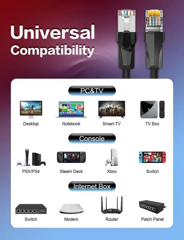 [Widely Applications]The Cat6 Ethernet cable is ideal for home network, indoor/outdoor use, PS4, X-box, Security camera, PC, Printer Hubs, Routers, Modems, Networking switch, Nintendo switch adapters and more.