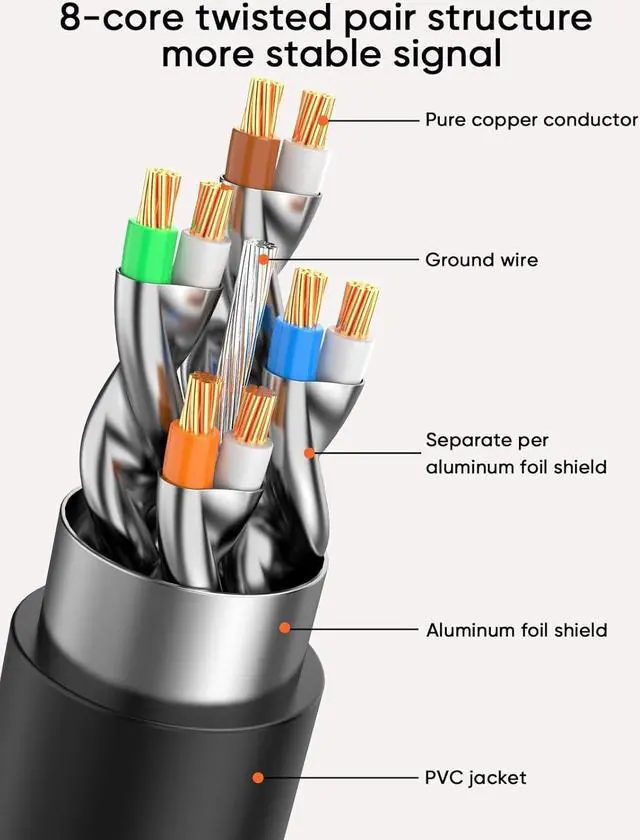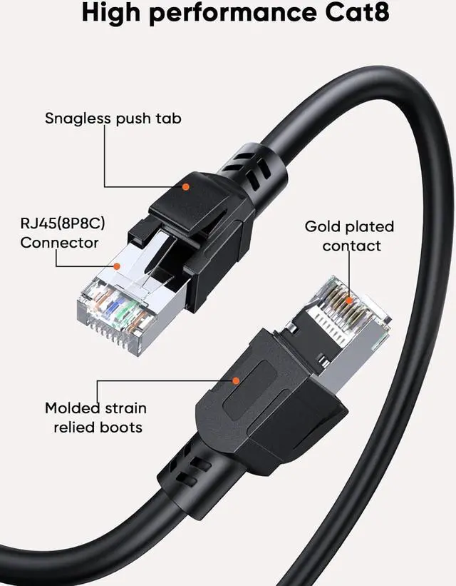 Double Shielded: With two shielded RJ45 connectors at both ends and Overall aluminum foil shield, allow the cat8 Ethernet cable high anti-interference and less signal attenuation. Protect against EMI/RFI interference, improved quality in twisting of the wires provides better protection from crosstalk, noise, and interference that can degrade the signal quality.