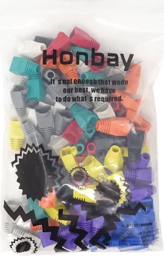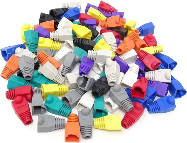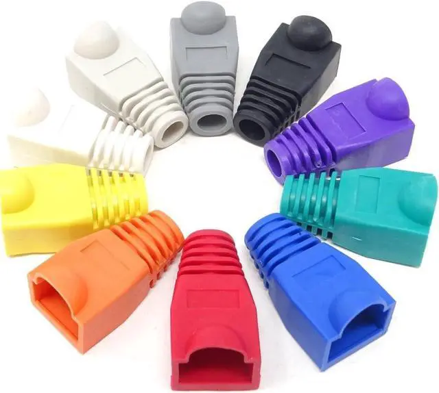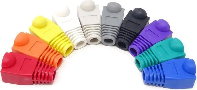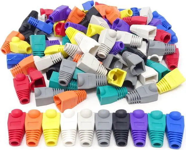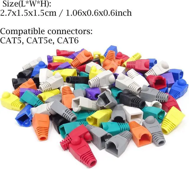Pack of 100, 10 colors, 10pcs for each color Material: plastic Size (L*W*H): 2.7 x 1.5 x 1.5 cm / 1.06 x 0.6 x 0.6 inch Compatible connectors: CAT5, CAT5e, CAT6 Help to protect RJ45 connectors from dust and oxidation, extend the RJ plugs life time