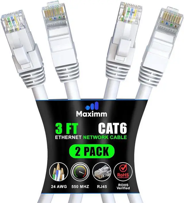 Maximm Cat 6 Ethernet Cable 3 ft (2-Pack) - High-Speed LAN Cable, Internet Cable, Patch Cable, and Network Cable - UTP, 10Gbps, 550MHz Ethernet Cord - White