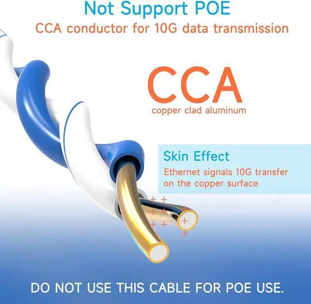Don' t Support POE1000ft Cat6 CCA are suggested to be used for data transmission, and don' t support POE, because copper clad aluminum conductors have high resistance and are prone to heat generation.