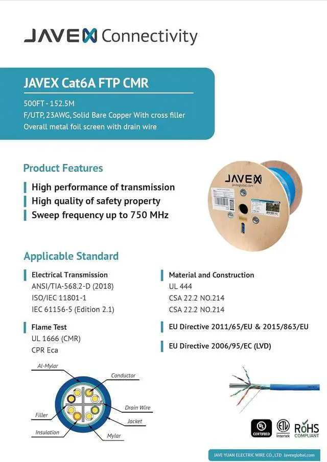 [High-speed Shielded Transmission] JAVEX premium Cat6A 23AWG CMR rated network cables meet upto-650Mhz performance to support data transmission and comply with IEEE 802.3 af (PoE) / IEEE 802.3 at (PoE+) in structure cabling for horizontal and building backbone. The FTP shield design helps prevent EMI and eliminate cross-talk