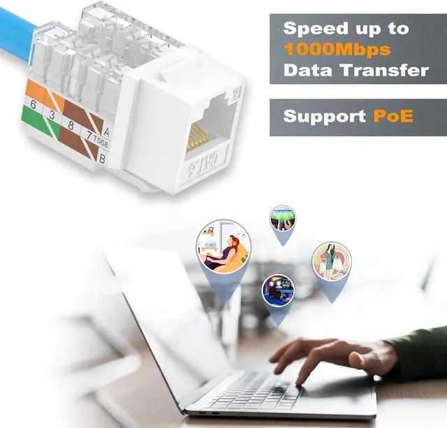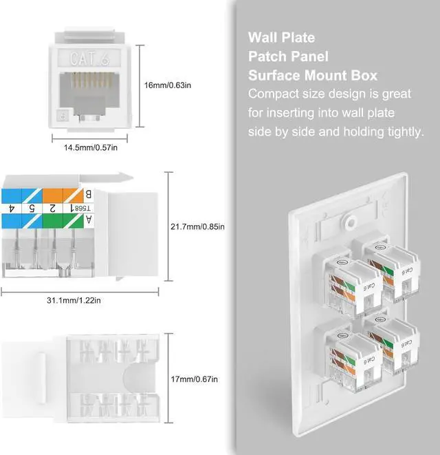 CAT6 PERFORMANCE: The RJ45 wall jacks accept cat6/cat5e/cat5 solid UTP network cables (23/24 AWG). Meet Category 6 performance in compliance with the ANSI/TIA/EIA 568-C. 2 standard and support PoE. Compatible with a 1000/100Mbps ethernet network.